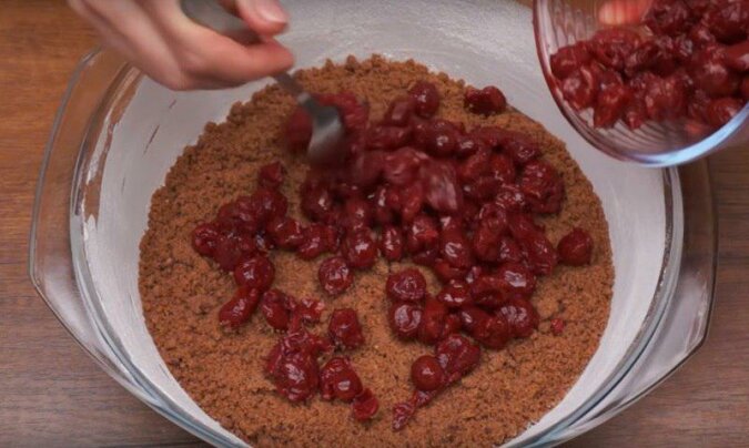 Wiśnie wymieszaj z cynamonem, a uzyskaną masę rozłóż na wierzchu okruchów. Do tego nadają się zarówno wiśnie konserwowane, tak i świeże lub mrożone.