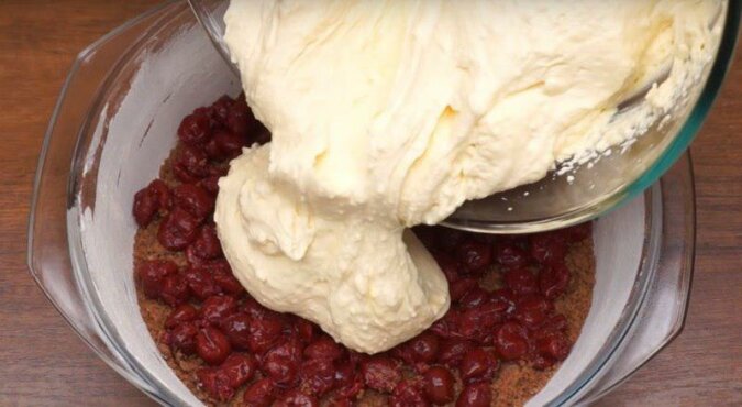 Masę twarogową rozłóż na wiśniach, a następnie wygładź za pomocą łyżki.