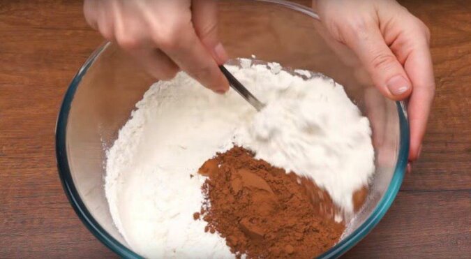 Następnie przygotuj kruche ciasto. Dlatego mąkę wymieszaj z kakao, a potem dodaj cukier.