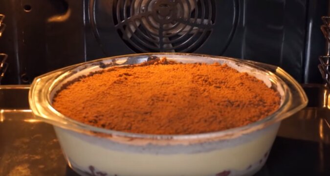 Teraz posyp wierzch okruchami i znowu wygładź. Zapiekankę z twarogu należy piec w piekarniku w temperaturze 180 stopni C. przez 75 minut.