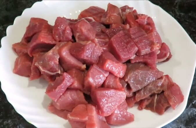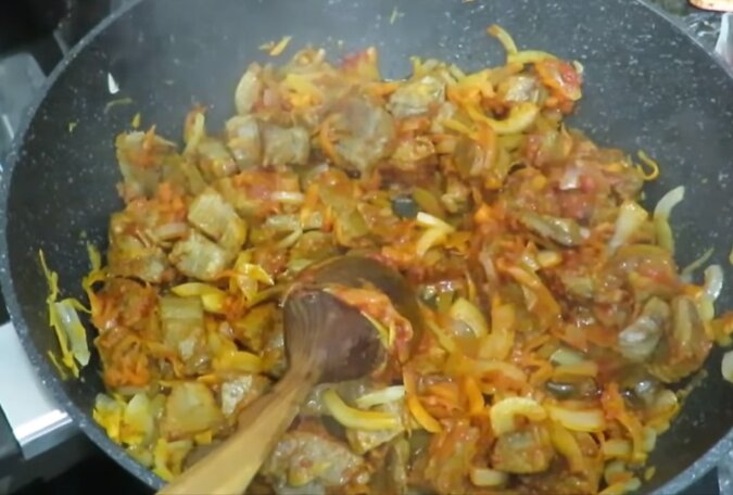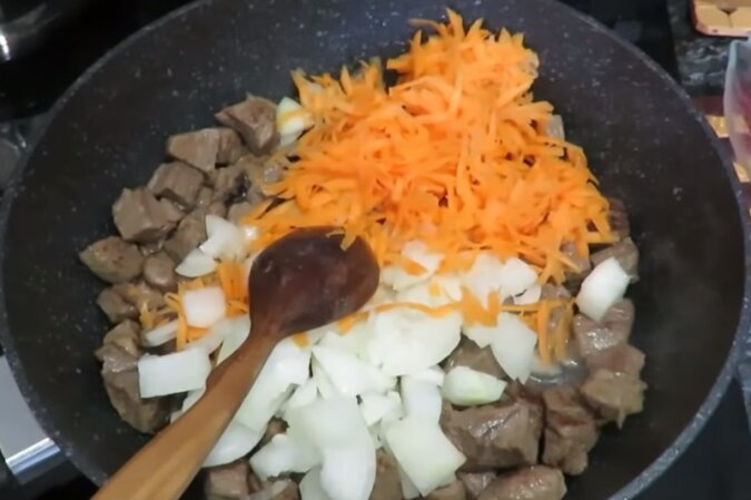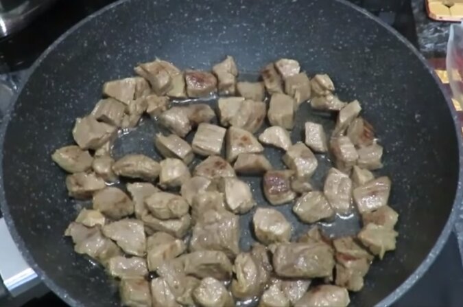 Następnie na rozgrzanej patelni trzeba usmażyć mięso do momentu, aż nabierze złocistego koloru.