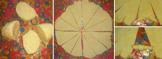 Teraz trzeba podzielić warstwę na 12 trójkątów. Wykonuj małe cięcia i zwijaj rogaliki. Aby zapobiec rozwijaniu się rogali, ciasto należy cienko rozwałkować, natomiast rogaliki zawijać dość ciasno, naciągając delikatnie do dołu.