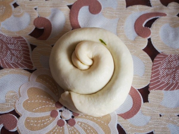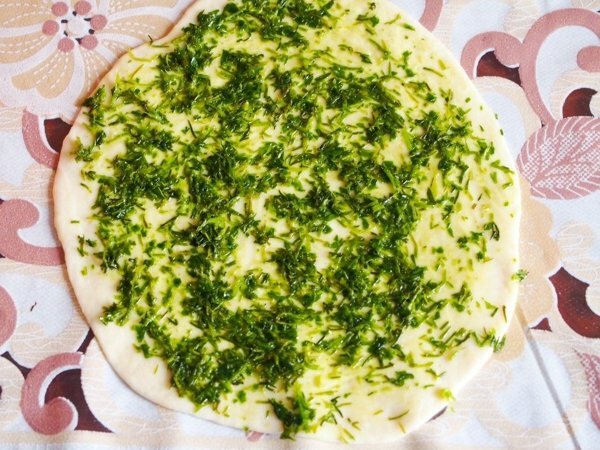 4. Za 20 minut pokroić ciasto na 7 kawałków. Rozwałkować każdą część tak dokładnie, jak to możliwe. Smarować zielonym olejem.