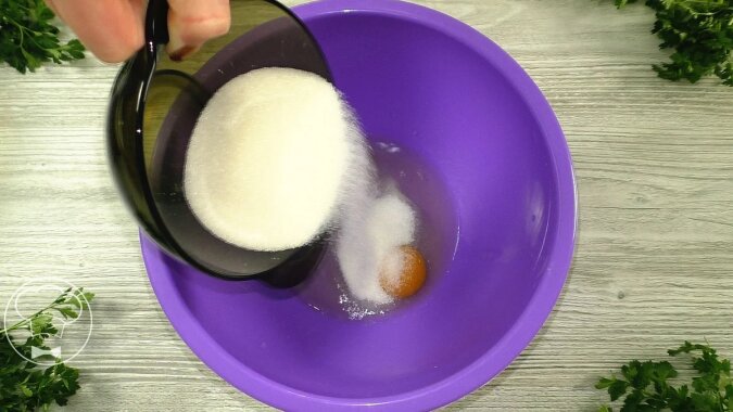 W osobnej misce wbijamy jajka, dodajemy cukier i mieszamy.