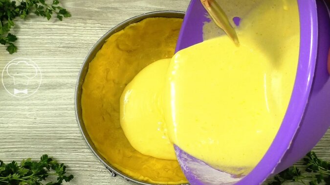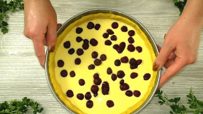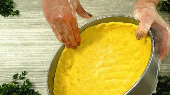 Palcami rozciągamy ciasto na naczyniu do pieczenia (mam kształt 25 cm), do takich ciast wygodne są formy z wysokimi brzegami. Ponieważ nadzienie podczas pieczenia wzrasta..
