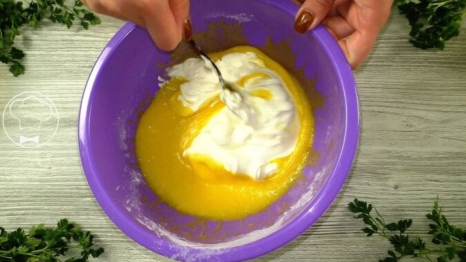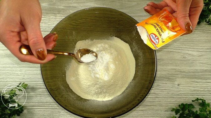 Do przesianej mąki dodajemy proszek do pieczenia i szczyptę soli, mieszmy, aby suche składniki dobrze się połączyły.