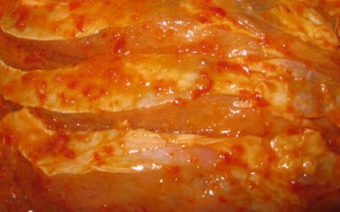 2. Włóż mięso do głębokiej miski i marynuj go, dodając adżikę z pieprzu oraz musztardę. Rozłóż marynatę między „plasterkami” mięsa, a następnie włóż mięso do lodówki na 2 godziny.
