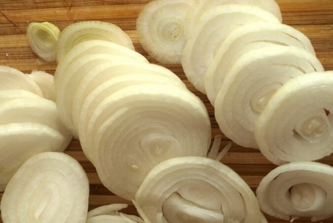 3. Pokrój cebulę w krążki, dodaj sól, czarny pieprz i ocet. Pozostaw na 10 minut.