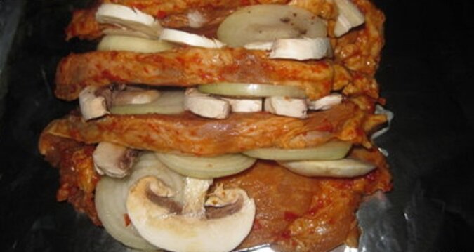 4. Grzyby pokrój na plastry. Mięso wydostań z lodówki, cebulę i grzyby rozłóż między „plasterkami” mięsa.