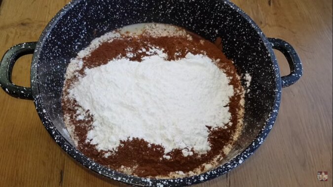 Najpierw wlewamy mleko, najlepiej do garnka o grubym dni, dodajemy mąkę, kakao, cukier puder i wanilinę. Mieszamy i stawiamy na ogień.