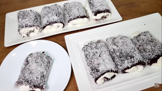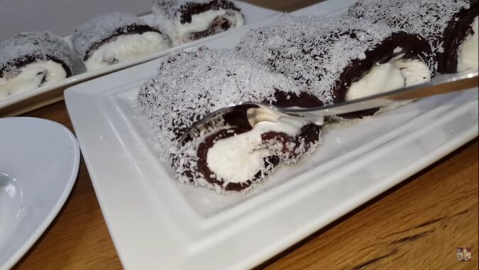 Następnie kroimy nasz placek na pół, a następnie na kolejne pięć części i zwijamy je w rolady.