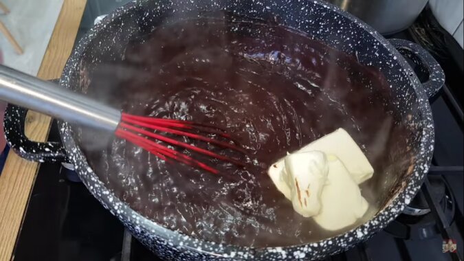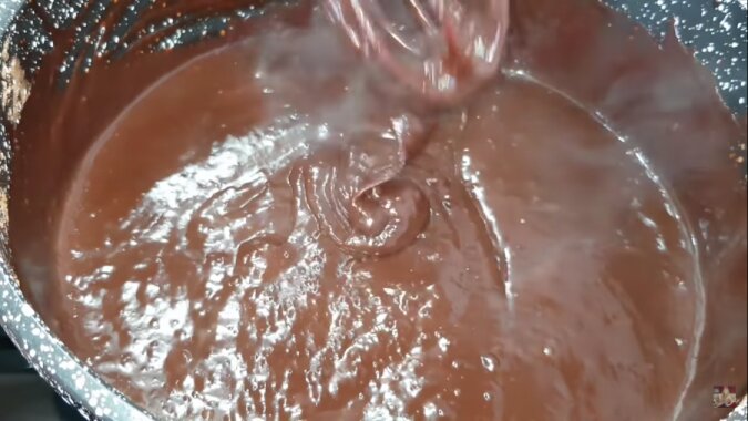Masę czekoladową należy gotować przez około dziesięć minut, nie zapominając o jej mieszaniu, aż dobrze zgęstnieje. Zdejmujemy ją z ognia po pojawieniu się pierwszych bąbelków. Następnie dodajemy masło. Wszystko dobrze mieszamy, aż uzyskamy jednorodną masę.