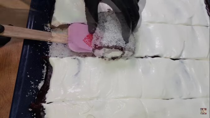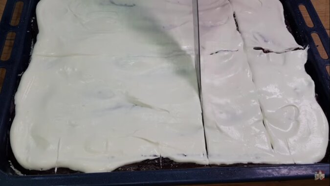 Po stwardnieniu masy czekoladowej nakładamy na jej wierzch krem.