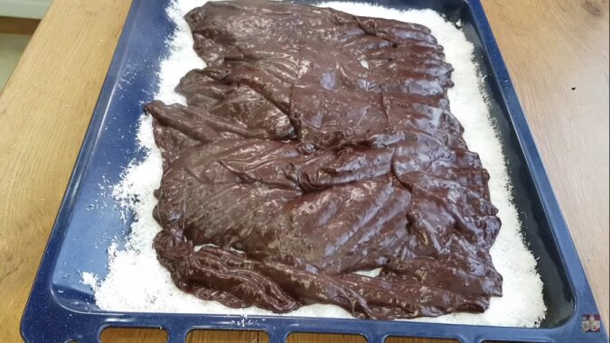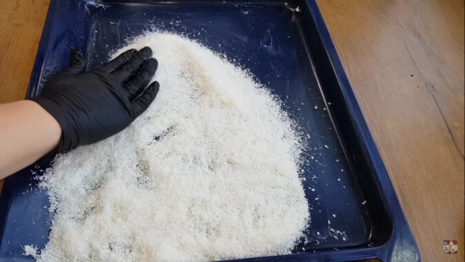 W trakcie nagrzewania się masy przygotowujemy foremkę, do której będziemy wkładać nasz deser – posmarujemy ją masłem i posypujemy płatkami kokosowymi.