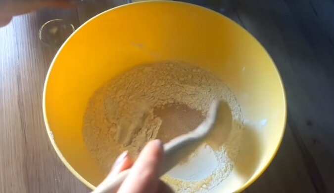 Przesianą mąkę wymieszaj z solą i suszonymi drożdżami.