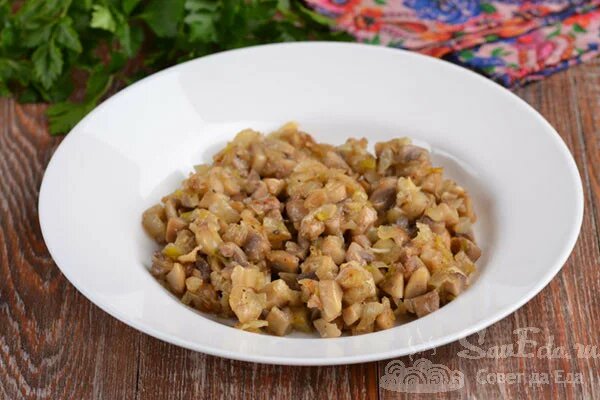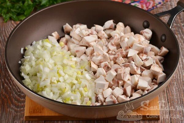 2. Grzyby lub pieczarki kroimy w drobną kostkę, drobno siekamy cebulę i wrzucamy na patelnię z olejem (3 łyżki). Smażymy na średnim ogniu przez około 10 minut, aż powstały płyn odparuje, a cebula stanie się miękka. Na koniec dodajemy sól i pieprz.