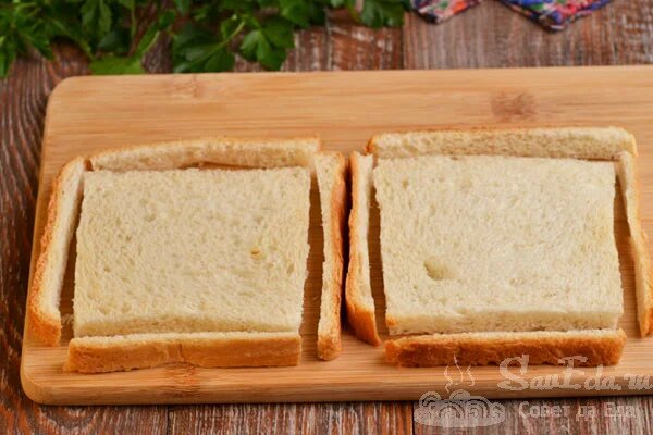 6. W trakcie przygotowywania nadzienia odcinamy skórki z kromek chleba. Skórki można pokroić w kostkę i przygotować z nich krakersy w mikrofalówce lub w piekarniku.