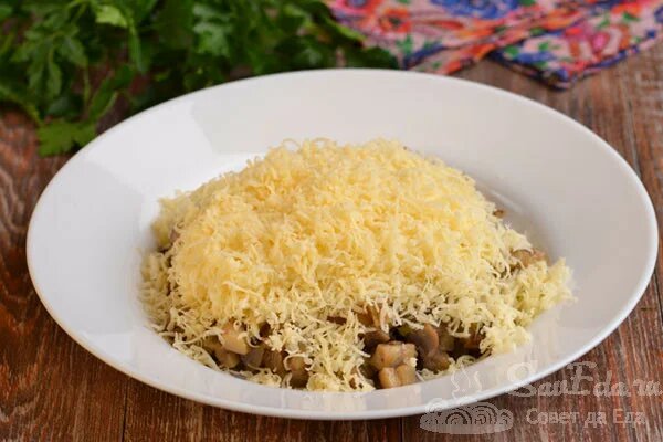 4. Ścieramy ser na drobnej tarce i dodajemy go do grzybów.