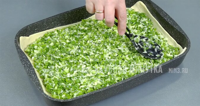 Ciasto może być dowolne. Dzisiaj mam francuskie. Rozwałkuję go cienko. Układam na dnie formy. Na górze wykładam nadzienie.