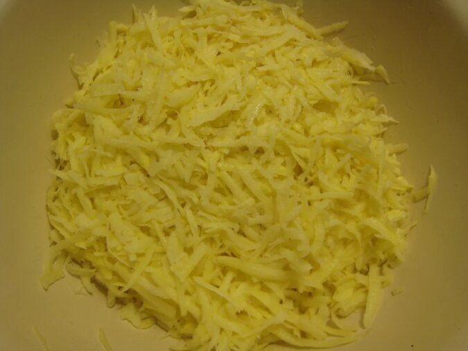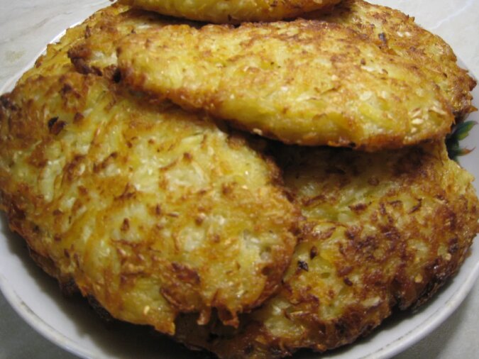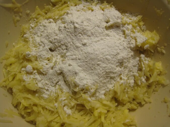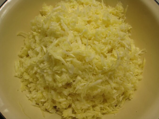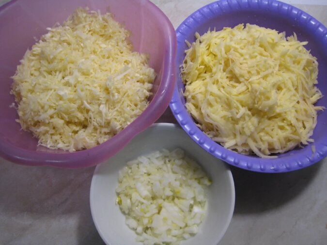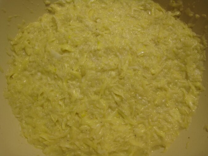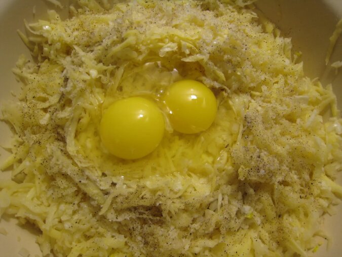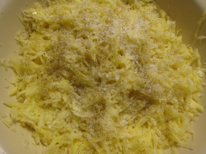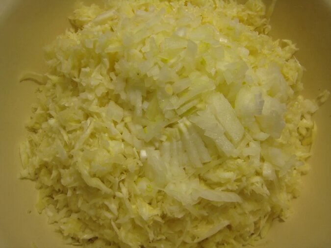 Kapustę i ziemniaki pocieramy na dużej tarce, drobno posiekamy cebulę. Polecam lekko wycisnąć ziemniaki, w przeciwnym razie mieszanina okaże się dość płynna.