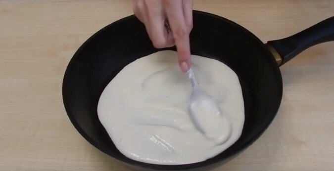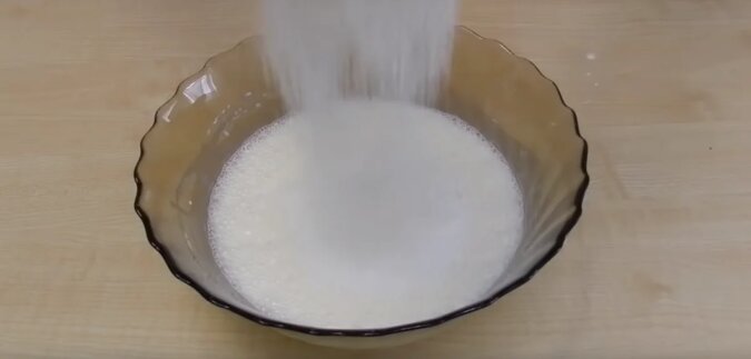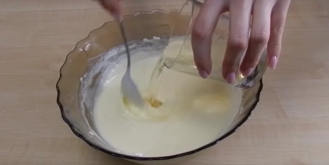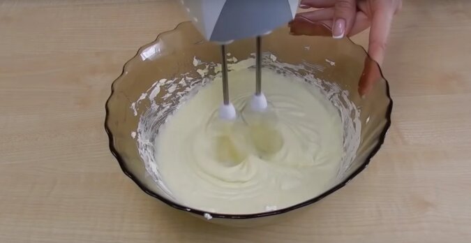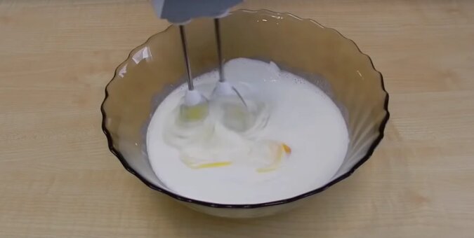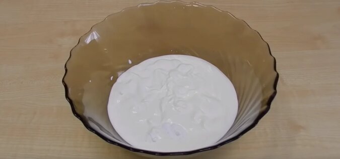 1. Najpierw przygotujemy warstwy ciasta. Kwaśną śmietanę łączymy z sodą. Wszystko dokładnie mieszamy