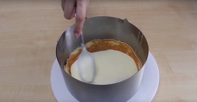 8. Teraz formujemy ciasto. Kładziemy na talerzu regulowany pierścień do ciasta, zatem wkładamy do niego pierwszą warstwę ciasta, a następnie warstwę smarujemy kwaśną śmietaną. Podobnie formujemy całe ciasto, smarując każda jego warstwę kremem. Ciasto wkładamy do lodówki na 3 lub 4 godziny (aż żelatyna zrobi się całkowicie sztywna)