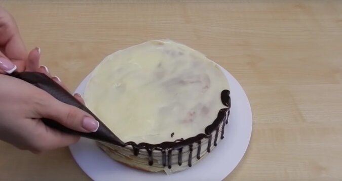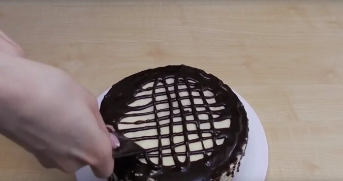 10. Wierzch ciasta dekorujemy siatką czekoladową. Delikatne i pyszne ciasto gotowe do podania
