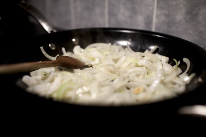 Posiekaj cebulę na małe kawałki i usmaż na patelni zolejem, aż zrumieni się na złocisty kolor.