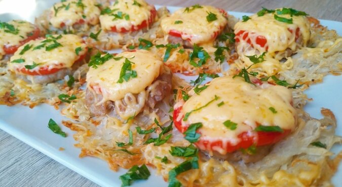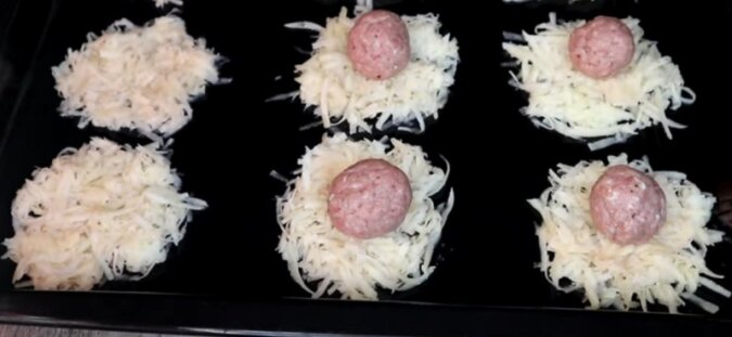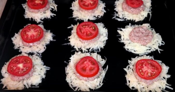Na wierzchu ułóż kulki z mięsa mielonego, a następnie nadaj im płaski kształt.