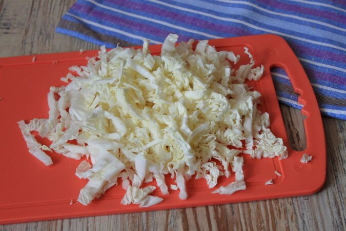 Jeśli używasz białej kapusty do sałątki, polecam pokroić ją cienko, a następnie ugnieść lekko rękami, aż będzie miękka. Kapustę pekińską kroimy w większe kawałki i nie ugniatamy. Ja wolę używać kapustę pekińską.