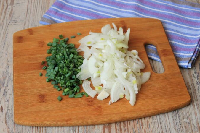 Pokrój cebulę na ćwiartki lub półpierścienie, zieloną cebulkę posiekaj... jak zwykle.