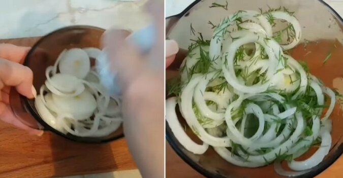W czasie smażenia kotletów należy przygować marynowaną cebulę. Cebula będzie służyć jako doskonały sos do kotletów. W tym celu do małego pojemnika wlej wodę i ocet, dobrze wymieszaj. Do marynaty dodaj pokrojoną w kółka cebulę, a także posiekany koperek.