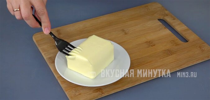 Masło należy zmiękczyć. Po prostu zostawiam go na stole do uzyskania pożądanego stanu. Masło, oczywiście, biorę pyszne. Nie margarynę!