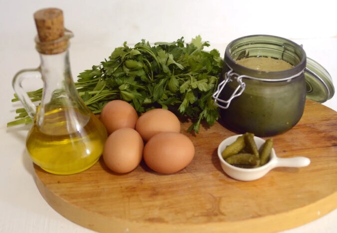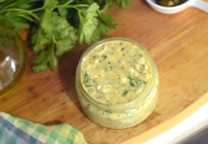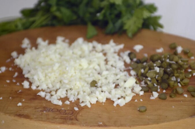 Posiekaj świeżą natkę pietruszki, marynowane ogórki i białka jajek tak drobno, jak to możliwe i dodaj do pasty. My dodaliśmy także kilka kaparów, które od dawna czekały w lodówce na swoją kolejkę.