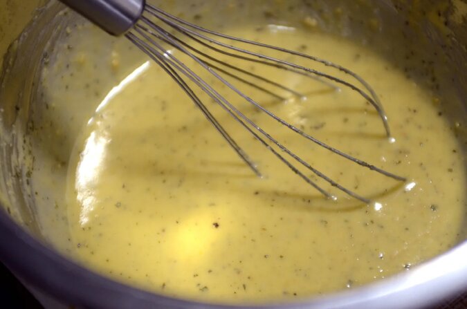 Pasta powinna być jednolita, dlatego olej dodajemy stopniowo i nie przestajemy ubijać. Następnie dodaj ocet winny lub jabłkowy, zmielony czarny pieprz do smaku, zioła prowansalskie (estragon, tymianek, cząber) oraz sól.
