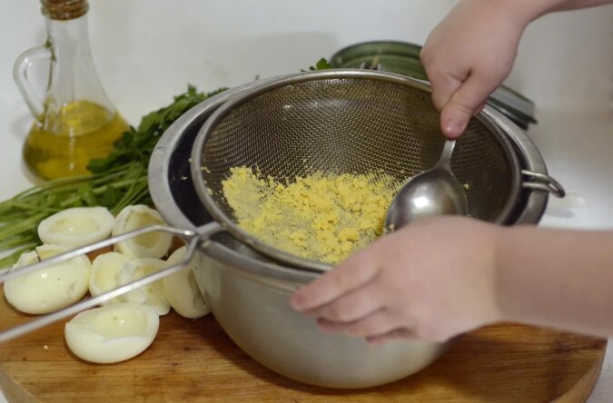 Zetrzyj żółtka przez drobne sito lub zmiażdż je widelcem.