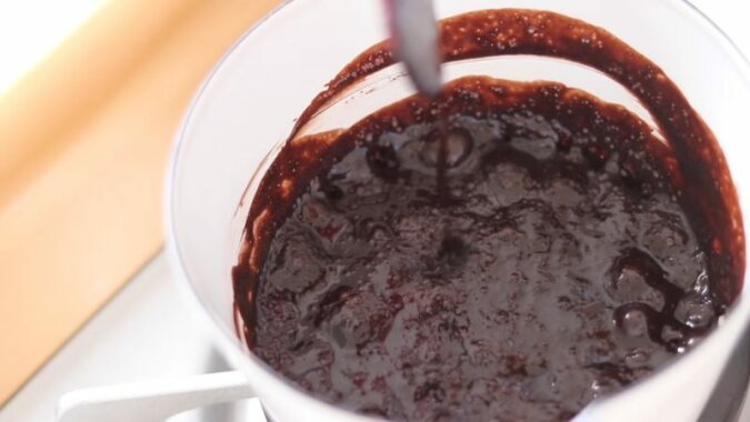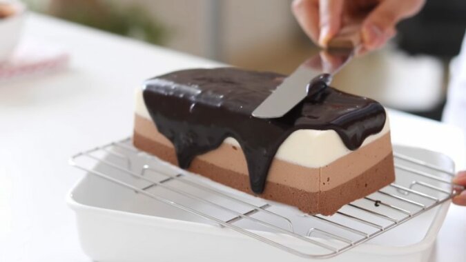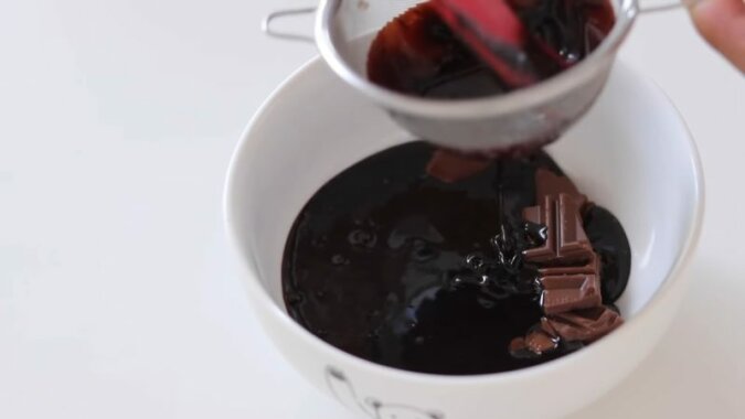 9. Ostatnim etapem jest przygotowanie glazury czekoladowej. Żelatynę należy rozpuścić w wodzie. W osobnym pojemniku należy posiekać 30 gramów czekolady. Do kakao dodajemy cukier, zatem mieszamy. Dodajemy śmietankę, stawiamy na ogniu i gotujemy, aż pojawią się bąbelki, a masa zgęstnieje.