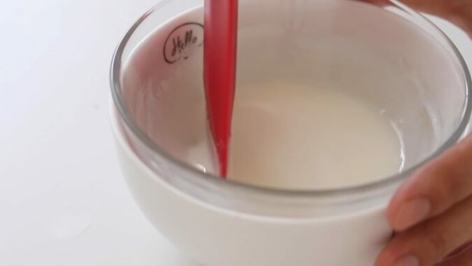 3. 5 gramów żelatyny należy namoczyć w 30 ml mleka, a zatem pozostawić do spęcznienia. Następnie żelatynę wkładamy do głębokiego talerza, do którego wlewamy gorącą wodę. Mieszamy do całkowitego rozpuszczenia żelatyny.