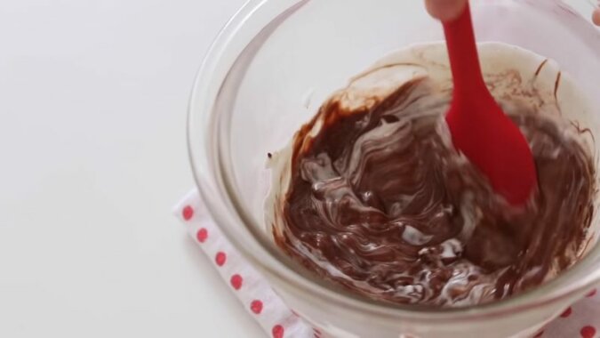 1. 120 gramów czekolady należy posiekać na kawałki, zatem dodać 50 ml podgrzanej do 60 stopni tłustej śmietanki. Wszystko dokładnie mieszamy.