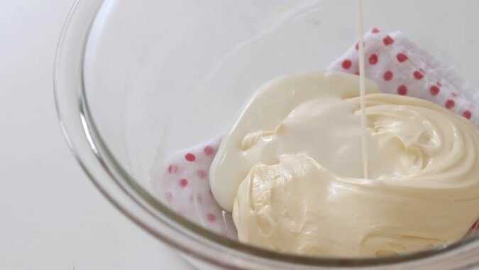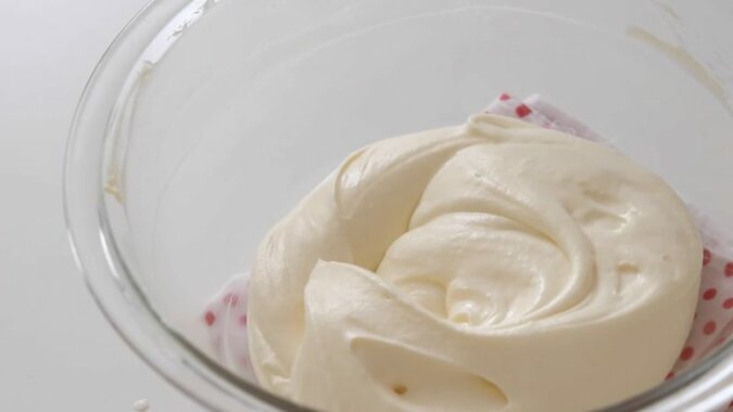 5. W osobnym pojemniku ubijamy 100 ml tłustej śmietanki oraz 15 g cukru aż do uzyskania puszystej masy. Do sera śmietankowego dodajemy śmietankę, dokładnie mieszamy.