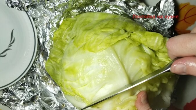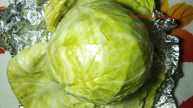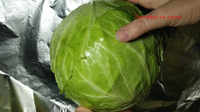 Myjemy główkę kapusty, ale nie usuwamy górnych uszkodzonych liści i nie wyrzucamy ich, ale pozostawiamy na wypadek, gdyby kapusta przypaliła się podczas pieczenia. Szczelnie owijamy kapustę folią, najważniejsze jest to, żeby nie było otworów na ujście pary, w przeciwnym razie kapusta może wyschnąć.