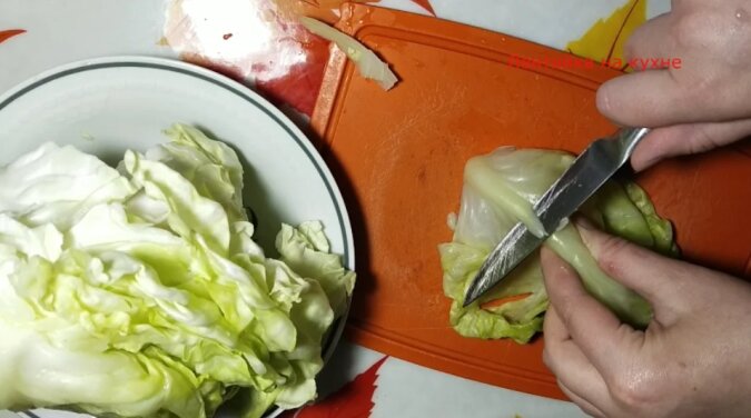 Następnie wycinamy całe liście, zaczynając od głąba i stopniowo zdejmujemy je z kapusty. Ja nie usuwam głąba kapusty, ale jeśli umiesz to zrobić, to zostanie ci tylko zdjęcie liści z kapusty.