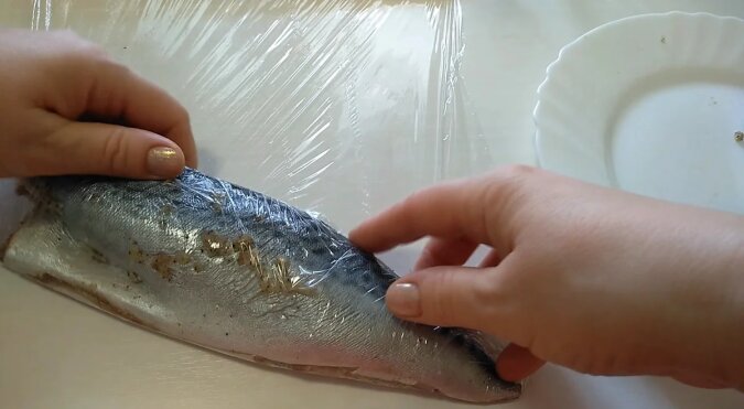 Delikatnie i bardzo ciasno owijam folią spożywczą. Rybę wkładam do lodówki na 3 godziny, w tym czasie sól się stopi, ryba będzie nasycona solą i aromatem przypraw.