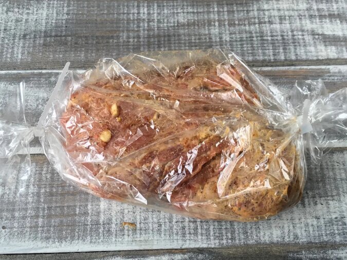 Umieścimy to w rękawie do pieczenia, zawiązując krawędzie rękawa i wrzucamy to do lodówki na co najmniej 12 godzin, za ten czas mięso zostanie dobrze promarynowane.
