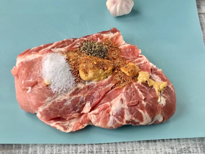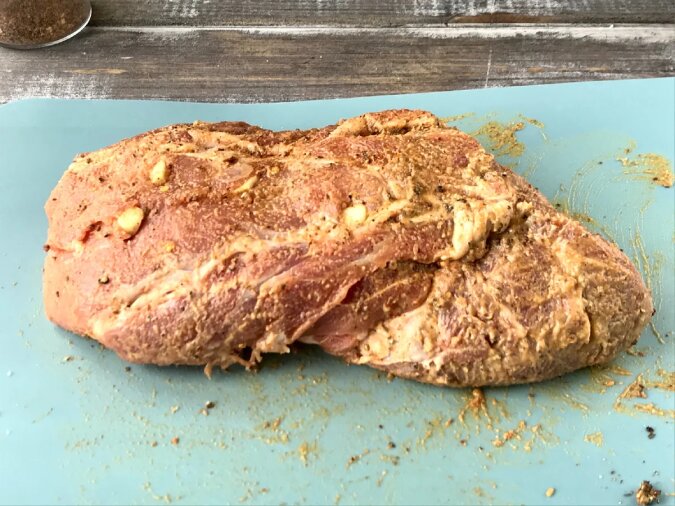 Posypujemy mieszanką pieprzu, suszonej wędzonej papryki i przypraw do wieprzowiny.