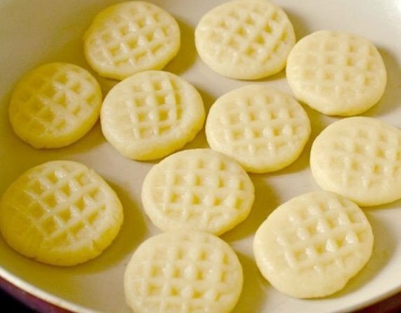 Rozgrzej patelnię na małym ogniu. Nie musisz ją smarować, natychmiast rozłóż ciasteczka. Piec z każdej strony, aż lekko się zrumienią.