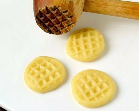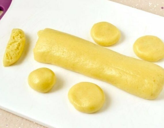 Kroimy wałek na kawałki, zwijamy je w kulki, a następnie spłaszczamy w krążki.