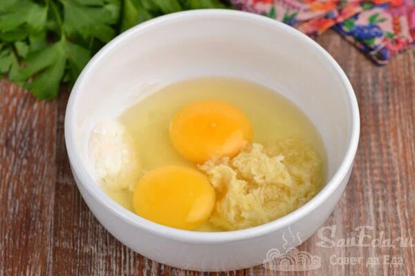 3. Do małego naczynia wbij jajka, dodaj sodę, cukier i czosnek (starty na drobnej tarce). Wymieszaj.