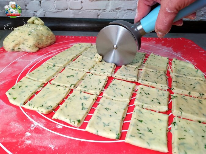 Wałkuję ciasto na posypanej mąką powierzchni do grubości 5 mm. Kroję ciasto na kwadraty lub prostokąty.