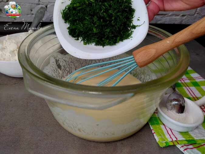 Dodaję posiekany koperek (30-50 gr), 1 łyżeczkę proszku do pieczenia i 350 gramów mąki. Dodaję 40 ml oleju roślinnego i zagniatam ciasto. Najpierw w misce, a potem na blacie. Dodaję tyle mąki, żeby ciasto trochę się kleiło do rąk.